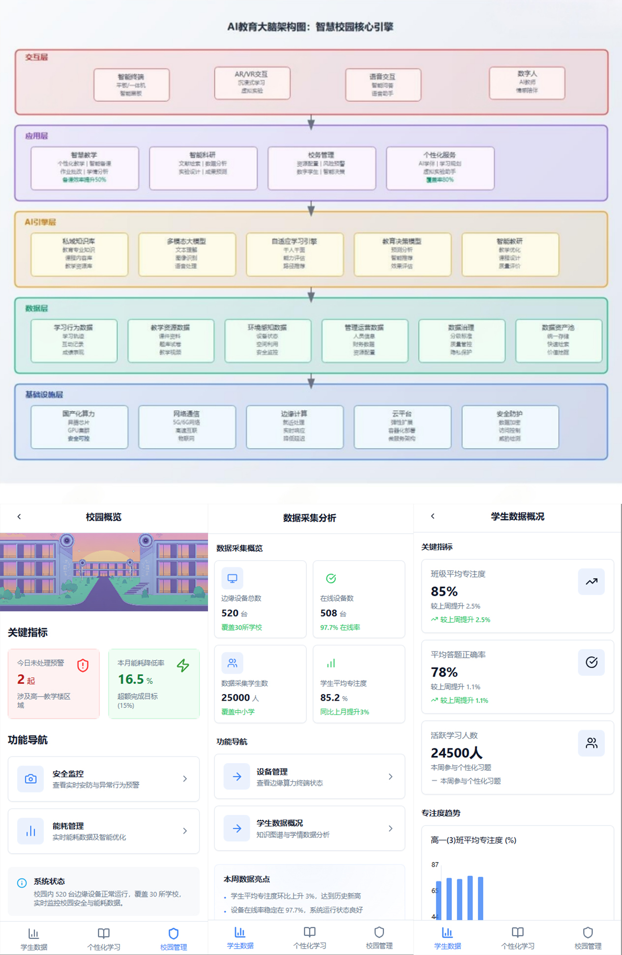 项目以计算能力为基础,保障数据处理的效率;通过边缘部署增强场景的实时响应能力;运用知识图谱提升服务的精准度,全方位实现对教育全链条的智能赋能,为教育数字化转型提供具有可复制性、可推广性的实践方案。