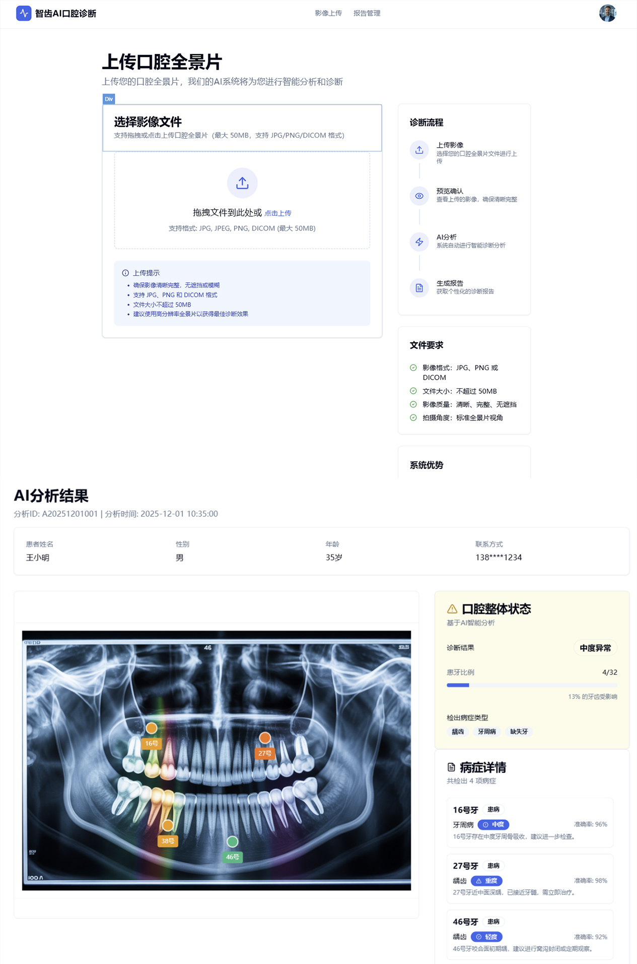 本项目为人工智能赋能口腔医疗的精准诊断工具,聚焦传统人工阅片效率低下、早期病症易出现漏诊这一痛点问题,依托医疗多模态大模型,实现口腔全景片的智能病症识别以及个性化报告生成。